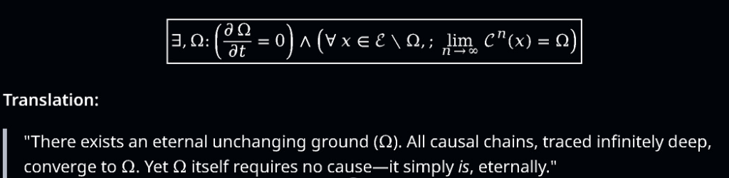 “There exists exactly one timeless, uncaused eternal ground (Ω). All things that exist within time emerge from Ω through infinite fractal chains of causation. Every causal inquiry, pursued to infinite depth, resolves into Ω.”